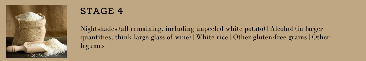 If a food or food group does not appear in the four stages, it indicates that you may want to avoid that food long-term due to its negative impact on those with autoimmune disease or its overall negative health consequences for the majority of the population.